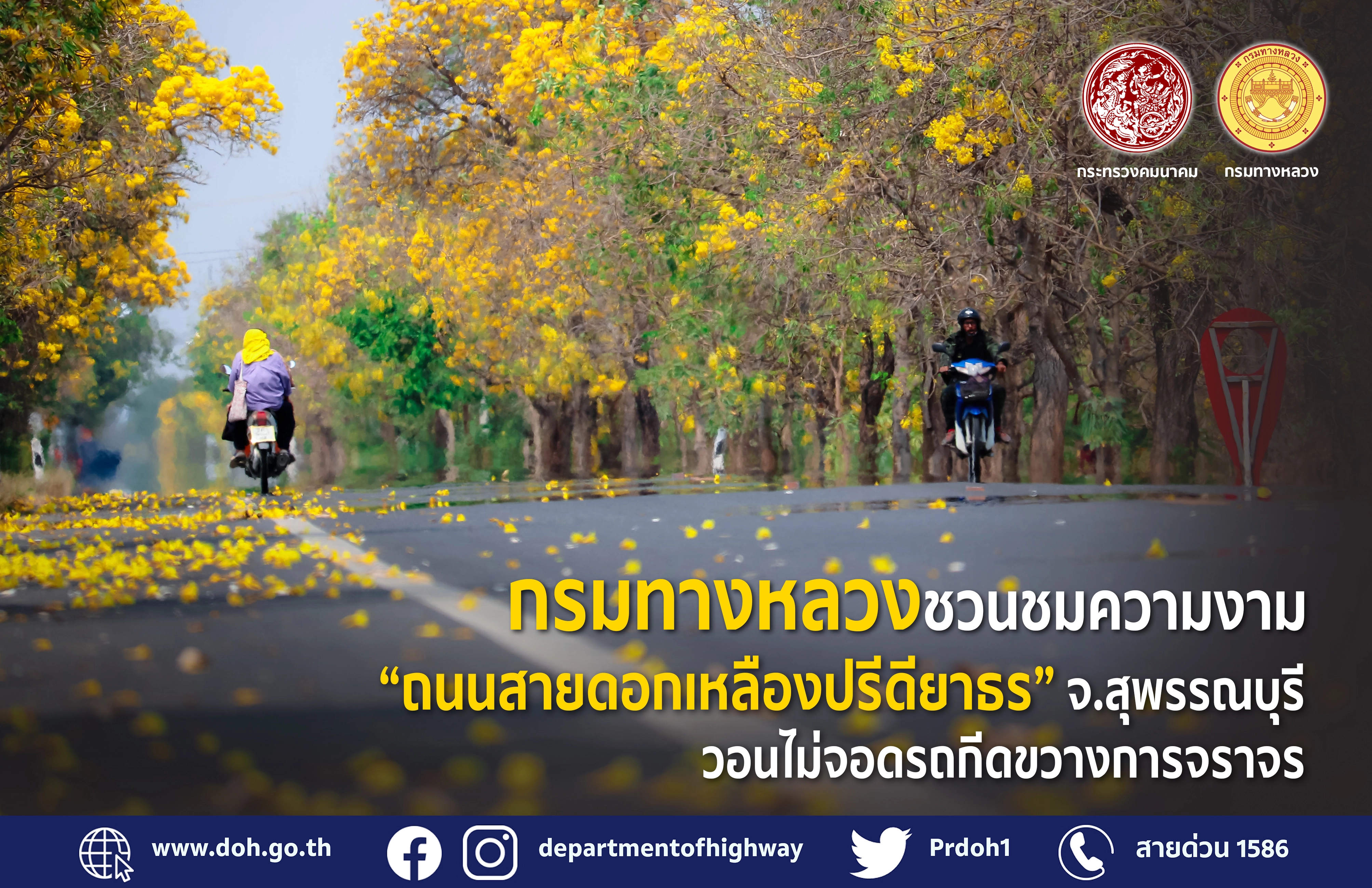 กรมทางหลวงชวนชมความงาม “ถนนสายดอกเหลืองปรีดียาธร” จ.สุพรรณบุรี วอนไม่จอดรถกีดขวางการจราจร