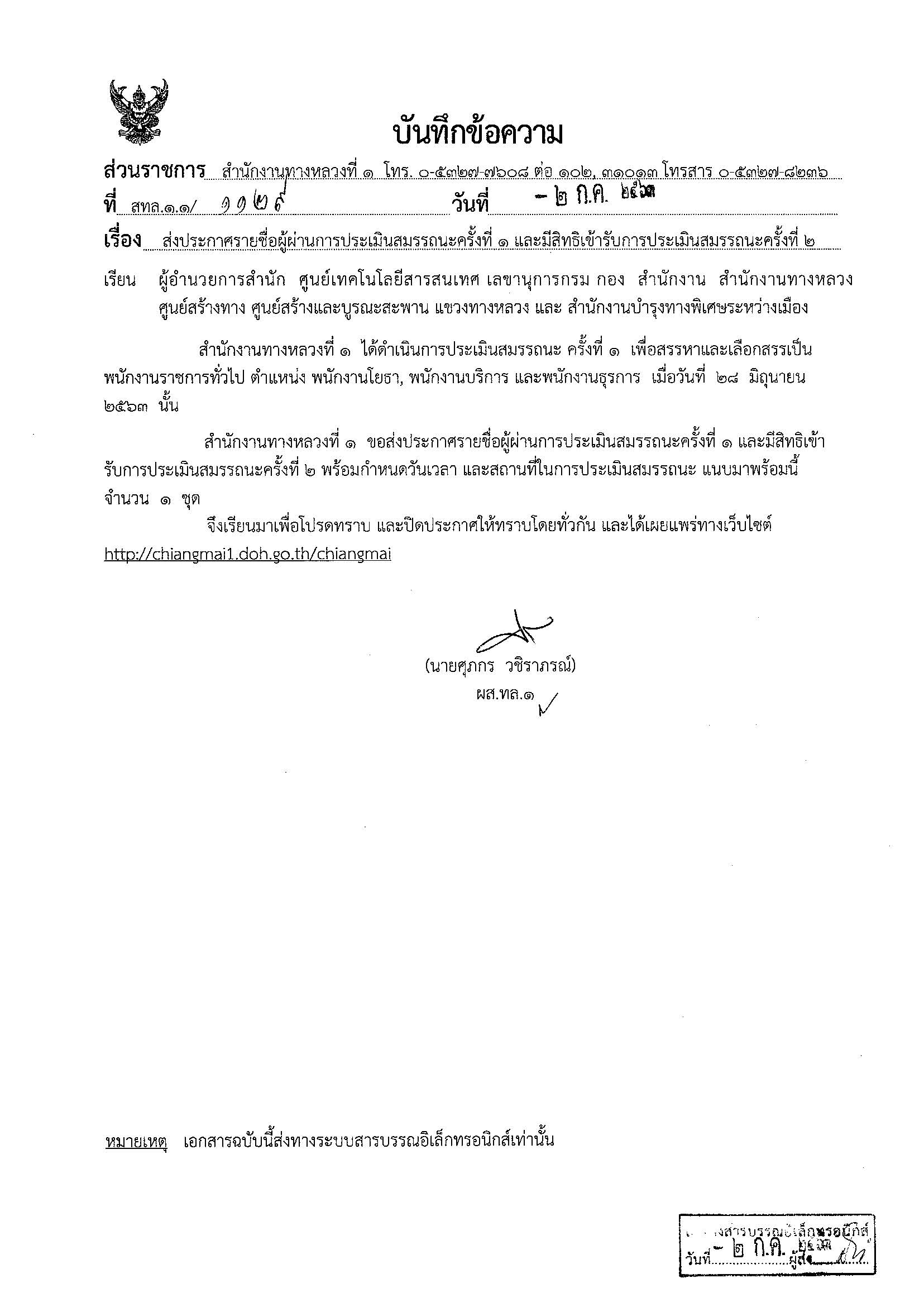 เรื่อง ประกาศรายชื่อผู้ผ่านการประเมินสมรรถนะครั้งที่ 1 และมีสิทธิ์เข้ารับการประเมินสมรรถนะครั้งที่ 2 ตำแหน่ง พนักงานโยธา