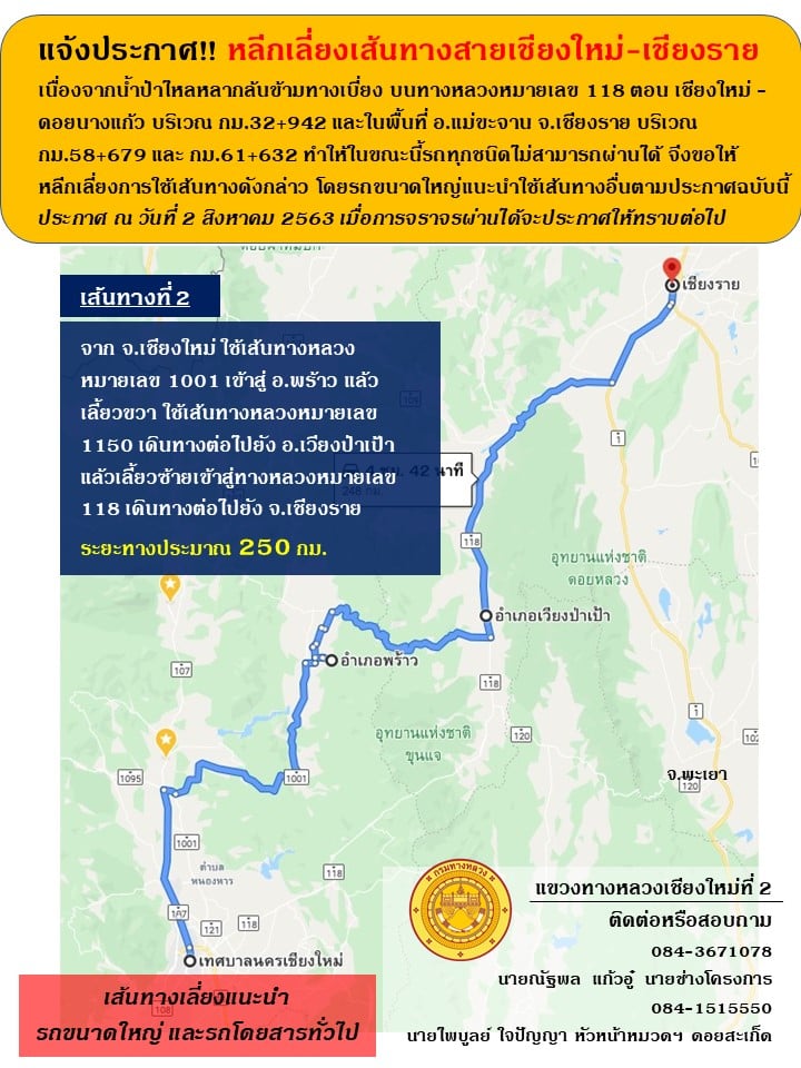 เนื่องจากน้ำป่าไหลหลากล้นข้ามทางเบี่ยง บนทางหลวงหมายเลข 118 ตอน เชียงใหม่ - ดอยนางแก้ว บริเวณ กม.32+942 และในพื้นที่ อ.แม่ขะจาน จ.เชียงราย บริเวณ กม.58+679 และ กม.61+632 ทำให้ในขณะนี้รถทุกชนิดไม่สามารถผ่านได้ จึงขอให้หลีกเลี่ยงการใช้เส้นทางดังกล่าว โดยรถขนาดใหญ่แนะนำใช้เส้นทางอื่นตามประกาศฉบับนี้