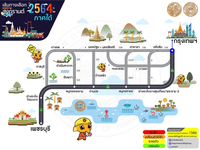 นายสราวุธ ทรงศิวิไล อธิบดีกรมทางหลวง เปิดเผยว่า ในช่วงเทศกาลสงกรานต์ 2564 นี้ เพื่อเป็นการอำนวยความสะดวกแก่ผู้เดินทางและหลีกเลี่ยงปัญหาการจราจรติดขัดในช่วงเทศกาลดังกล่าว กรมทางหลวงจึงได้แนะนำเส้นทางเลือกบนทางหลวงสายหลักและสายรอง ซึ่งจะช่วยให้ประชาชนวางแผนการเดินทางล่วงหน้าได้เป็นอย่างดี ดังนี้.-