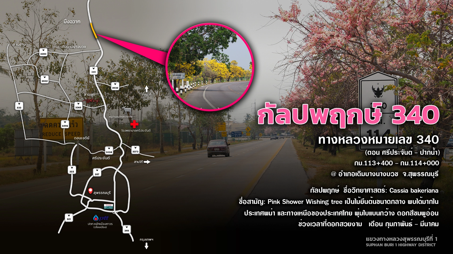 นอกจากถนนดอกไม้สวยดอกเหลืองปรีดียาธร ยังมีถนนสายดอกกัลปพฤกษ์ สีชมพูบานสะพรั่ง ออกดอกช่วงเดือนกุมภาพันธ์ – มีนาคม ตั้งอยู่บนทางหลวงหมายเลข 340 (ตอน ศรีประจันต์ – ปากน้ำ) บริเวณ กม.113+400 – กม.114 ระยะทางยาว 600 เมตร ช่วงเลยตลาดสามชุกไปทาง จ.ชัยนาท 10 กม. ก่อนถึงบึงฉวาก ในพื้นที่ อำเภอเดิมบางนางบวช จังหวัดสุพรรณบุรี โดยถนนดอกกัลปพฤกษ์จะอยู่ได้ประมาณ 2 - 3 สัปดาห์เท่านั้นก็จะร่วงหล่น กรมทางหลวงขอความร่วมมือประชาชนที่จะถ่ายภาพโปรดจอดยานพาหนะบริเวณสองข้างทางอย่างระมัดระวัง เพื่อป้องกันปัญหาการจราจรติดขัดและอุบัติเหตุที่อาจเกิดขึ้น รวมถึงไม่กีดขวางการจราจรบนทางหลวง และขอความร่วมมือนักท่องเที่ยวเดินทางอย่างปลอดภัยและใส่ใจสิ่งแวดล้อม ไม่ทำให้ดอกไม้เกิดความเสียหาย โปรดขับรถด้วยความระมัดระวัง ปฏิบัติตามป้ายเตือน ป้ายแนะนำ เพื่อความปลอดภัยในการเดินทาง และปฏิบัติตามมาตรฐานสาธารณสุขภายใต้วิถีชีวิตรูปแบบใหม่ “ท่องเที่ยวสุขใจ ห่างไกลโควิด - 19” สวมหน้ากาก ล้างมือ รักษาระยะห่าง หากประชาชนต้องการสอบถามข้อมูลรายละเอียดเพิ่มเติมสามารถติดต่อได้ที่แขวงทางหลวงสุพรรณบุรีที่ 1 โทร. 0 3552 2133 หรือสายด่วนกรมทางหลวง 1586 (โทรฟรีทุกเครือข่ายตลอด 24 ชั่วโมง)
