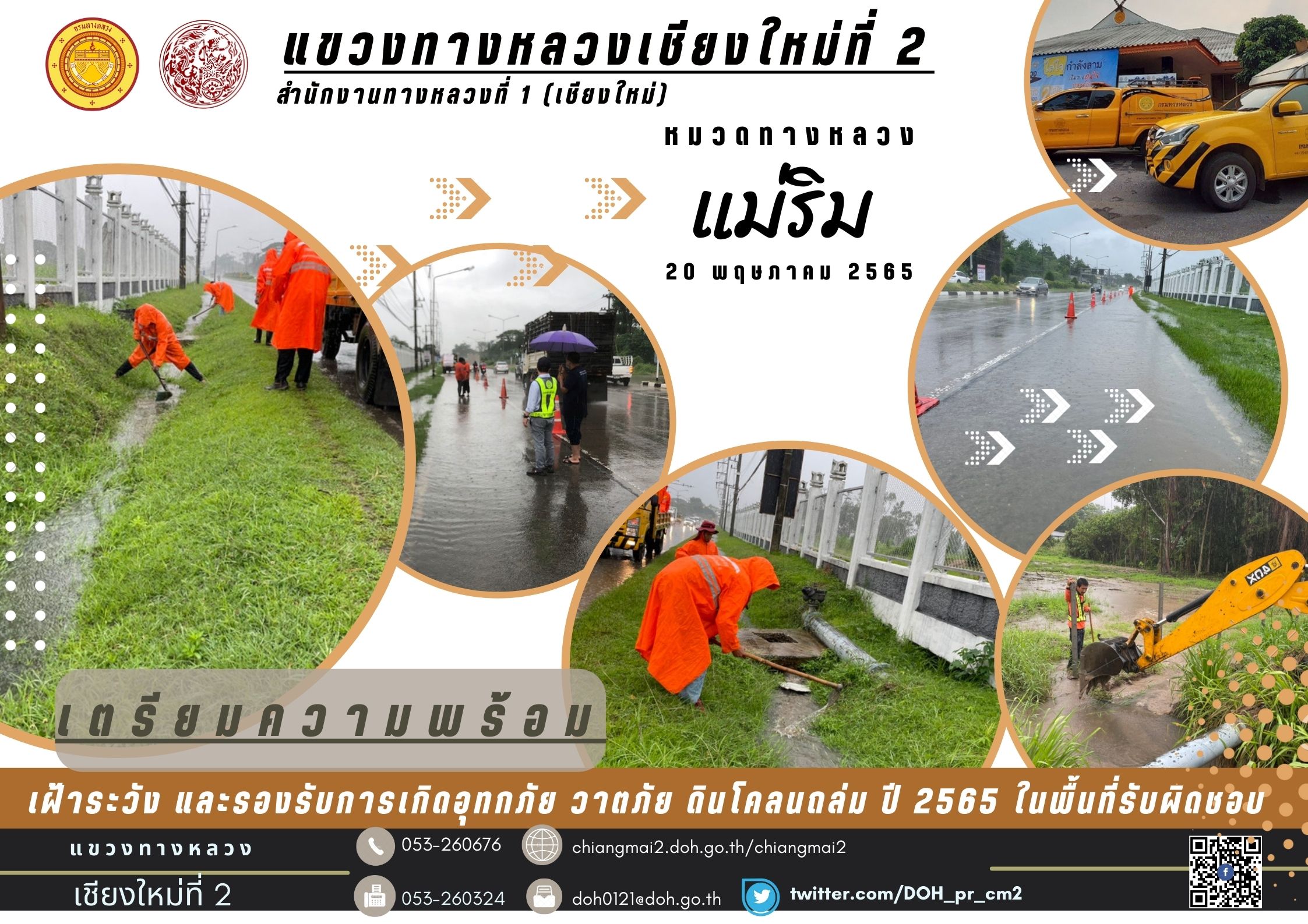 นายนิคม เทพบุตร ผู้อำนวยการแขวงทางหลวงเชียงใหม่ที่ 2 สั่งการทุกหน่วยงานในสังกัด เตรียมความพร้อม เฝ้าระวัง และรองรับการเกิดอุทกภัย วาตภัย ดินโคลนถล่ม ปี 2565 โดยให้เจ้าหน้าที่ในสังกัดลงพื้นที่เฝ้าระวังดูแลเส้นทางรับผิดชอบ ตลอดจนดูแลเก็บเศษใบไม้ และขยะอุดตัน ตามตะแกรงระบายน้ำ ฝาท่อระบายน้ำ เพื่ออำนวยความสะดวกแก่ผู้ใช้รถใช้ถนนในการเดินทางสัญจร