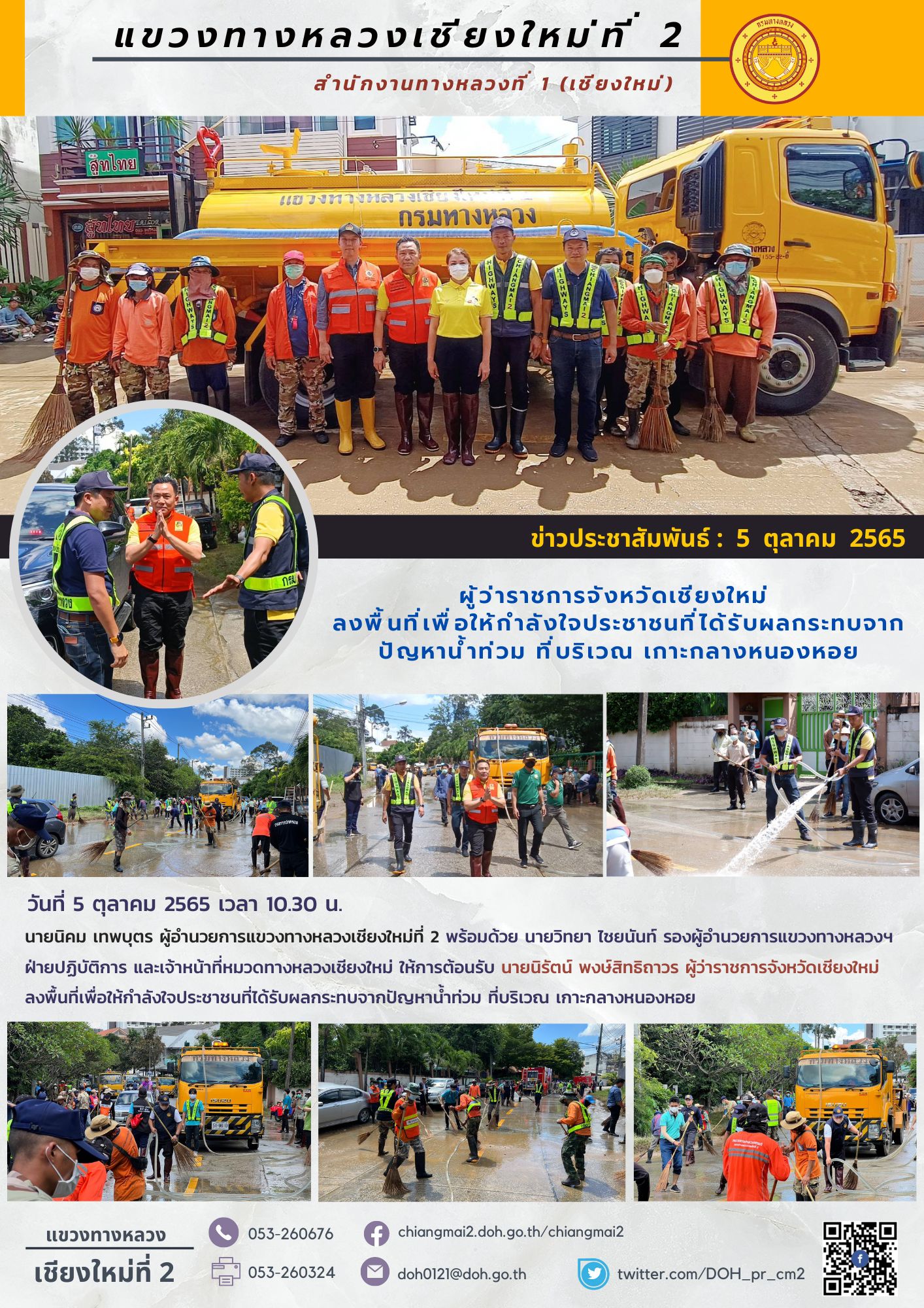 นายนิคม เทพบุตร ผู้อำนวยการแขวงทางหลวงเชียงใหม่ที่ 2 พร้อมด้วย นายวิทยา ไชยนันท์ รองผู้อำนวยการแขวงทางหลวงฯ ฝ่ายปฏิบัติการ และเจ้าหน้าที่หมวดทางหลวงเชียงใหม่ ให้การต้อนรับนายนิรัตน์ พงษ์สิทธิถาวร ผู้ว่าราชการจังหวัดเชียงใหม่ ลงพื้นที่เพื่อให้กำลังใจประชาชนที่ได้รับผลกระทบจากปัญหาน้ำท่วม ที่บริเวณ เกาะกลางหนองหอย