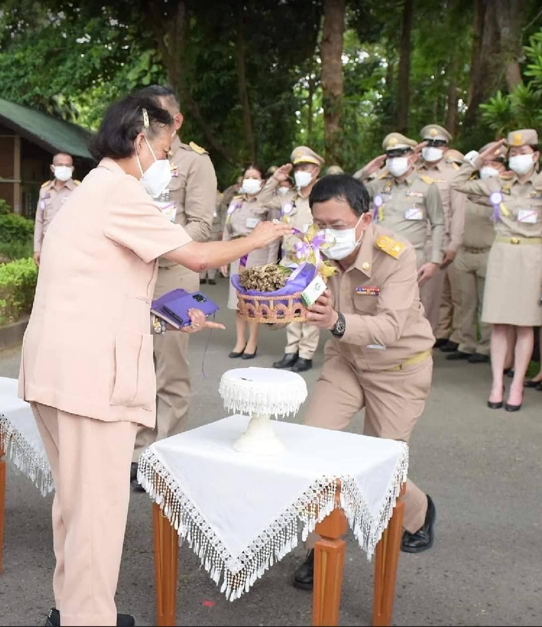 จากนั้น เสด็จไปยังลานหน้าอาคารอำนวยการ พระราชทานพระราชวโรกาสให้ ผู้แทนกรมพัฒนาที่ดิน, กรมชลประทาน, กรมทางหลวง, โครงการพัฒนาพื้นที่ป่าขุนแม่กวงอันเนื่องมาจากพระราชดำริ, โครงการพัฒนาพื้นที่ห้วยลานอันเนื่องมาจากพระราชดำริ, เครือข่ายคนรักษ์แฝก และกลุ่มแฝกหลวง บ้านซาง อำเภอแม่ริม เฝ้าทูลละอองพระบาท รับพระราชทานกล้าหญ้าแฝก ในการนี้ นายสราวุธ ทรงศรีวิไล อธิบดีกรมทางหลวง เป็นผู้รับพระราชทานกล้าหญ้าแฝกดอน สายพันธ์ปางกว้าง จำนวน 69 กล้า เพื่อนำไปใช้ประโยชน์ในด้านต่างๆและคืนความอุดมสมบูรณ์ของผืนแผ่นดินต่อไป
