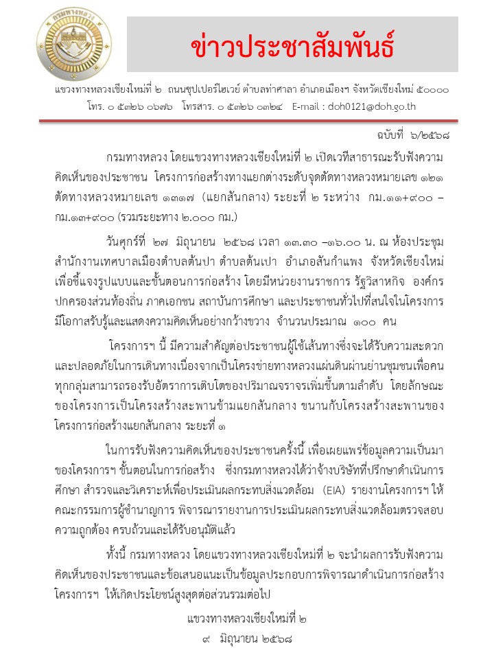 ดังนั้น เพื่อให้การดำเนินการโครงการของรัฐเป็นไปตามระเบียบสำนักนายกรัฐมนตรีว่าด้วยการรับฟังความคิดเห็นของประชาชน พ.ศ. 2548 แขวงทางหลวงเชียงใหม่ที่ 2 จึงขอเรียนเชิญประชาชนที่อยู่ในท้องที่ ตำบลสันกลาง อำเภอสันกำแพง, ตำบลชมภู อำเภอสารภี, อำเภอเมืองเชียงใหม่ จังหวัดเชียงใหม่ ประชาชนผู้สนใจทั่วไป และผู้มีส่วนได้ส่วนเสียทุกท่านเข้าร่วมการประชุมแสดงความคิดเห็นและข้อเสนอแนะในการประชุมรับฟังความคิดเห็นของประชาชน ในวันศุกร์ที่ 27 มิถุนายน 2568 เวลา 13.30 - 16.00 น. ณ ห้องประชุมเทศบาลเมืองต้นเปา ตำบลต้นเปา อำเภอสันกำแพง จังหวัดเชียงใหม่ โดยมีวิธีการรับฟังความคิดเห็นของประชาชนดังนี้