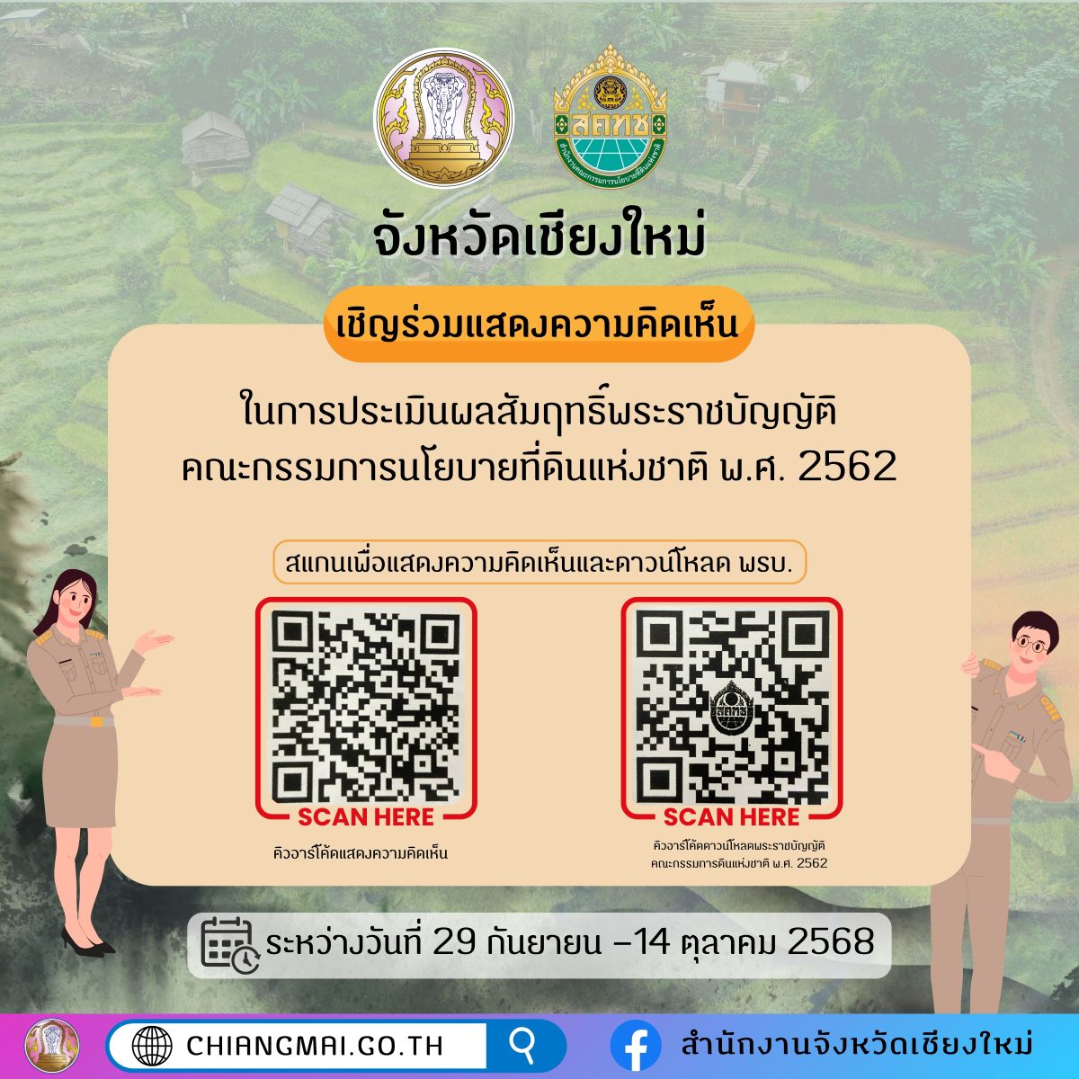 จังหวัดเชียงใหม่ขอเชิญชวนท่านร่วมแสดงความคิดเห็นในการประเมินผลสัมฤทธิ์ของพระราชบัญญัติคณะกรรมการนโยบายที่ดินแห่งชาติ พ.ศ.2562