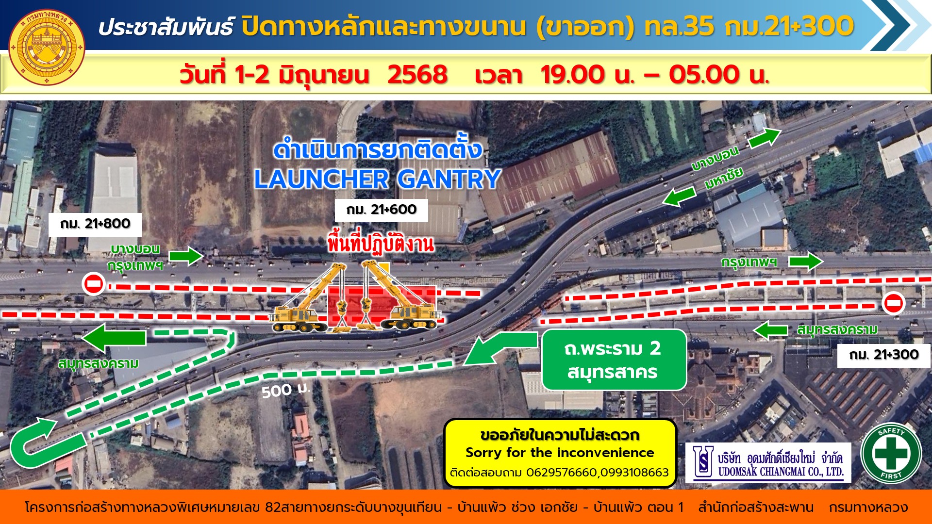โครงการก่อสร้างทางยกระดับบางขุนเทียน-บ้านแพ้ว ช่วงเอกชัย-บ้านแพ้ว ตอน 1 แจ้งปิดการจราจรชั่วคราวเพื่อยกติดตั้ง Launcher Gantry