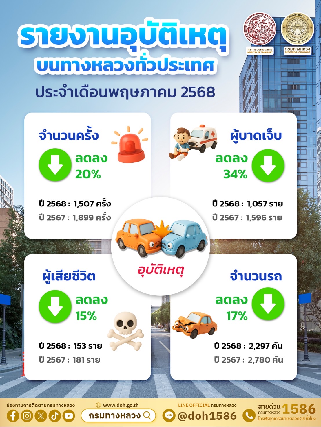 กรมทางหลวง สรุปอุบัติเหตุบนทางหลวงเดือนพฤษภาคม 2568 พบอุบัติเหตุลดลง 20% สาเหตุหลักขับเร็วเกินกฎหมายกำหนด