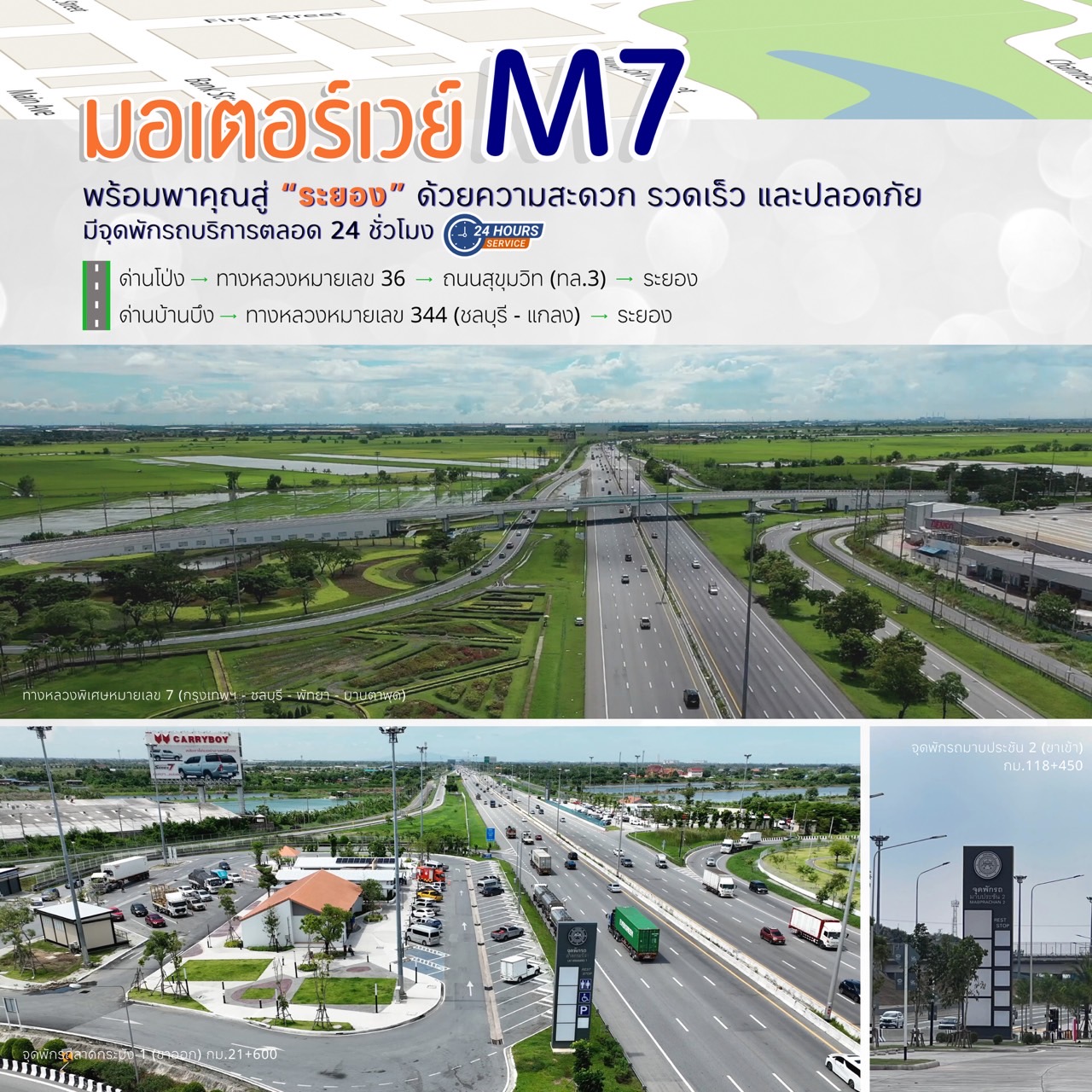 เดินทางสู่ความสุข ณ จังหวัดระยอง แบบง่ายๆ ด้วยมอเตอร์เวย์สาย 7 (กรุงเทพฯ - ชลบุรี - พัทยา - มาบตาพุด) เส้นทางที่เชื่อมต่อระหว่างกรุงเทพฯ สู่ภาคตะวันออกได้อย่างสะดวก รวดเร็ว และปลอดภัย พร้อมจุดพักรถให้บริการตลอด 24 ชั่วโมง ผู้ใช้ทางสามารถเลือกออกที่ ด่านโป่ง เข้าสู่ทางหลวงหมายเลข 36 และถนนสุขุมวิท (ทล.3) เพื่อเข้าสู่ตัวเมืองระยอง หรือใช้ทางออก ด่านบ้านบึง เข้าสู่ทางหลวงหมายเลข 344 (ชลบุรี - แกลง) เส้นทางเลี่ยงเมืองระยองที่สามารถเดินทางได้อย่างสะดวกยิ่งขึ้น