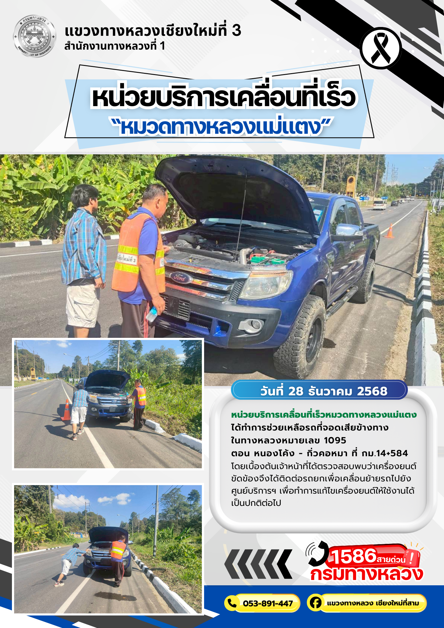 ชุดเคลื่อนที่เร็ว หมวดทางหลวงแม่แตง ได้ทำการช่วยเหลือรถที่จอดเสียข้างทาง ในทางหลวงหมายเลข 1095 ตอน หนองโค้ง-กิ่วคอหมา ที่ กม.14+584