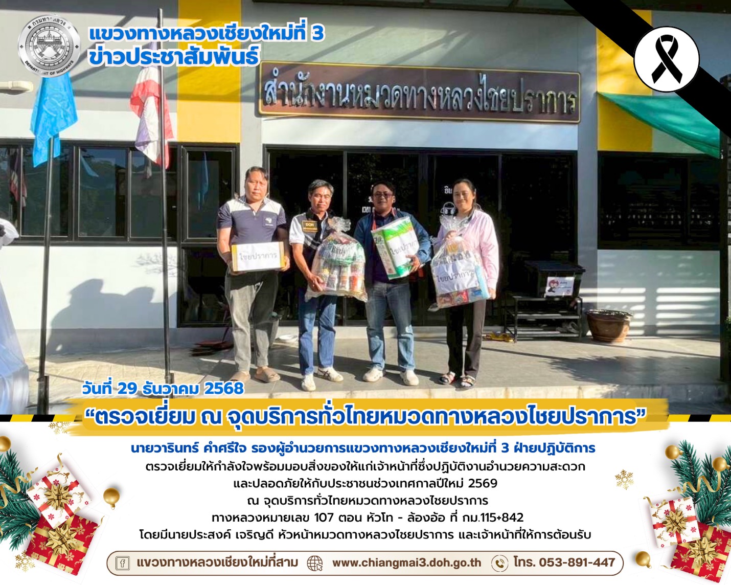 นายวารินทร์ คำศรีใจ รองผู้อำนวยการแขวงทางหลวง ฝ่ายปฏิบัติการ ลงพื้นที่ตรวจเยี่ยมให้กำลังใจพร้อมมอบสิ่งของให้แก่เจ้าหน้าที่ซึ่งปฏิบัติงานอำนวยความสะดวกและปลอดภัยให้กับประชาชนช่วงเทศกาลปีใหม่ 2569