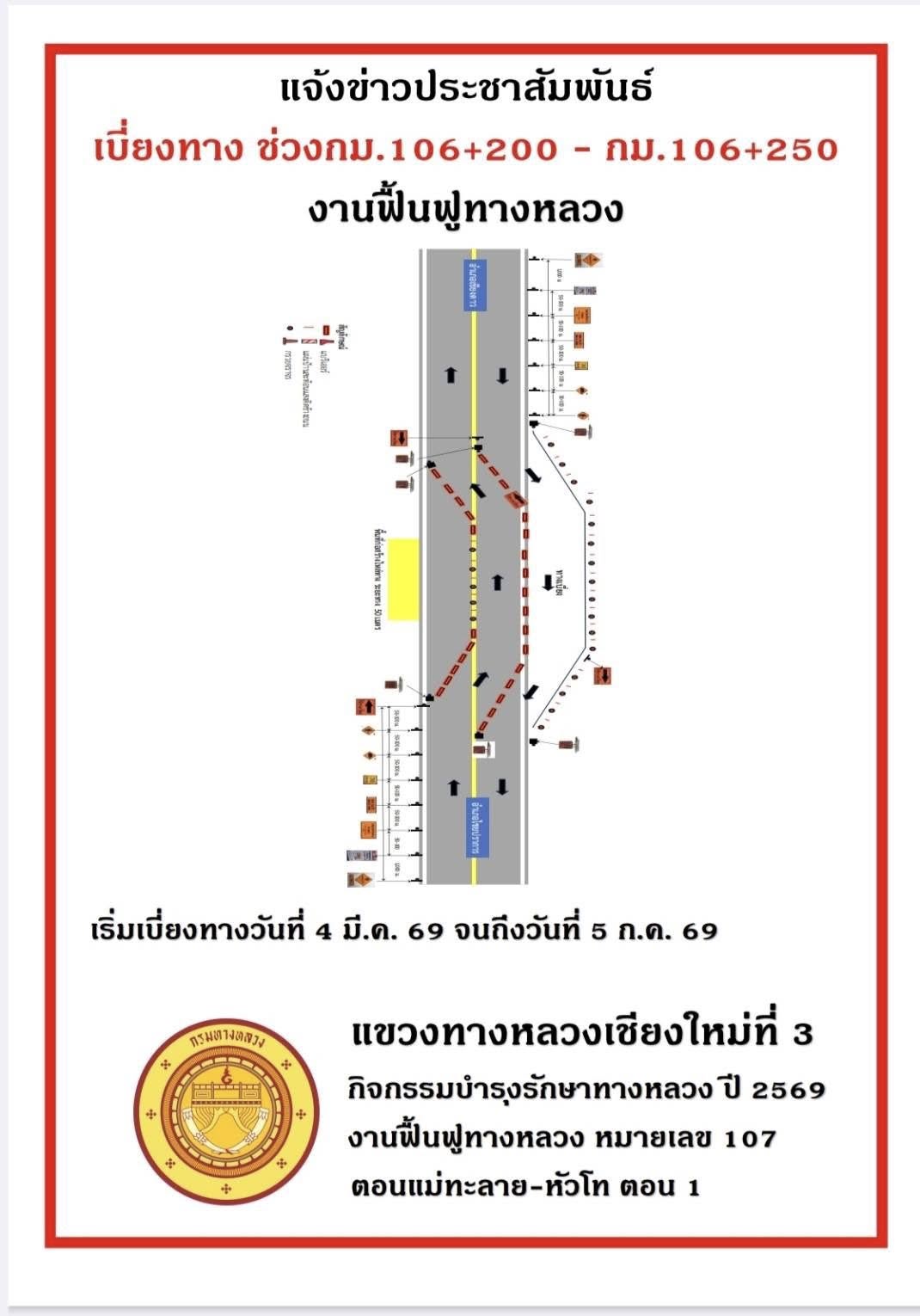 ขอแจ้งประชาสัมพันธ์ ทางเบี่ยงจราจรชั่วคราวระหว่างการก่อสร้าง งานฟื้นฟูทางหลวง บนทางหลวงหมายเลข 107 ตอน แม่ทะลาย-หัวโท ตอน 1 ระหว่าง กม.105+554 - กม.107+670