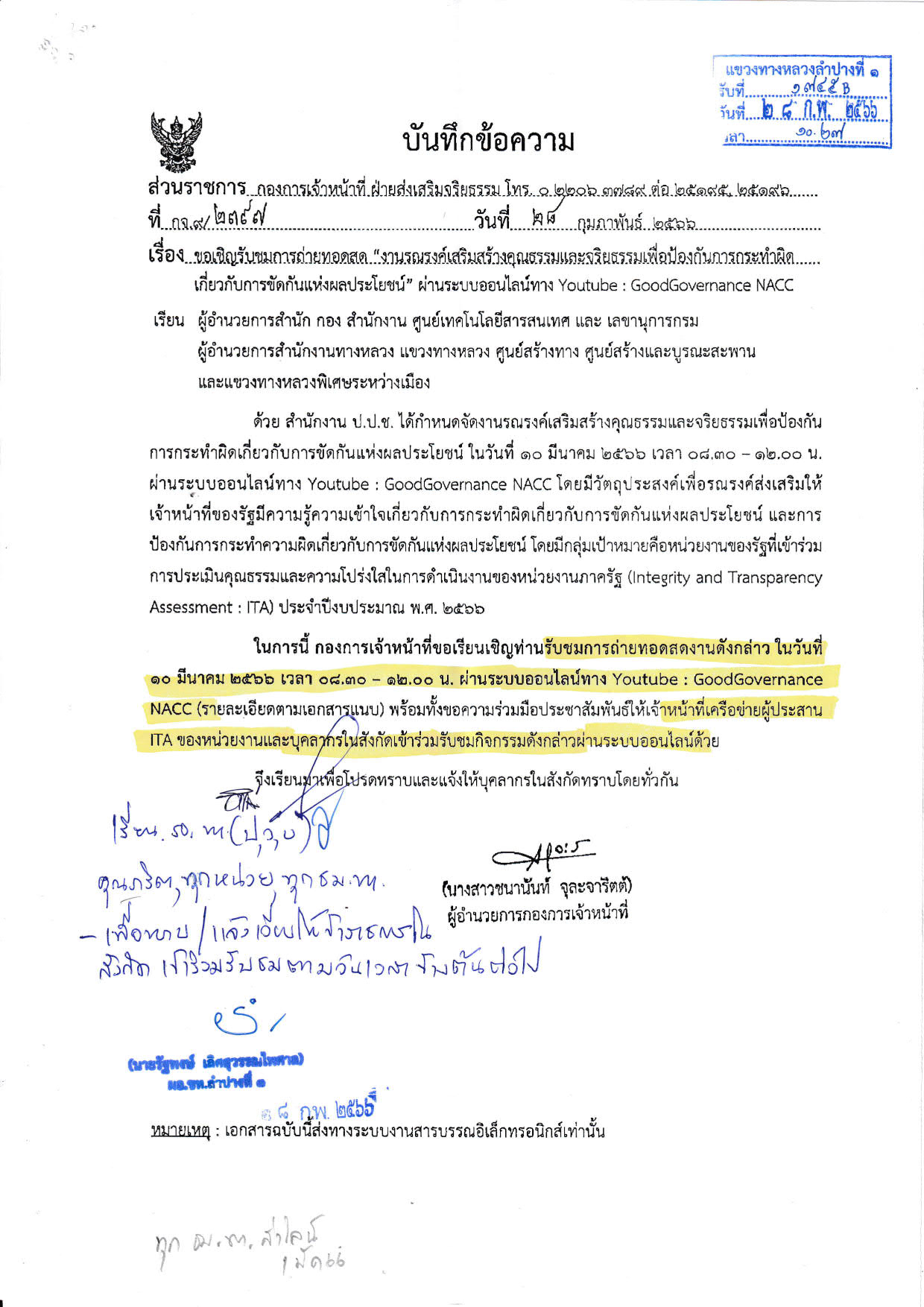 120 09/03/2566 ขอเชิญรับชมการถ่ายทอดสด "งานรณรงค์เสริมสร้างคุณธรรมและจริยธรรมเพื่อป้องกันการกระทำผิดเกี่ยวกับการขัดกันแห่งผลประโยชน์" ผ่านระบบออนไลน์ทาง Youtube : GoodGovernance NACC