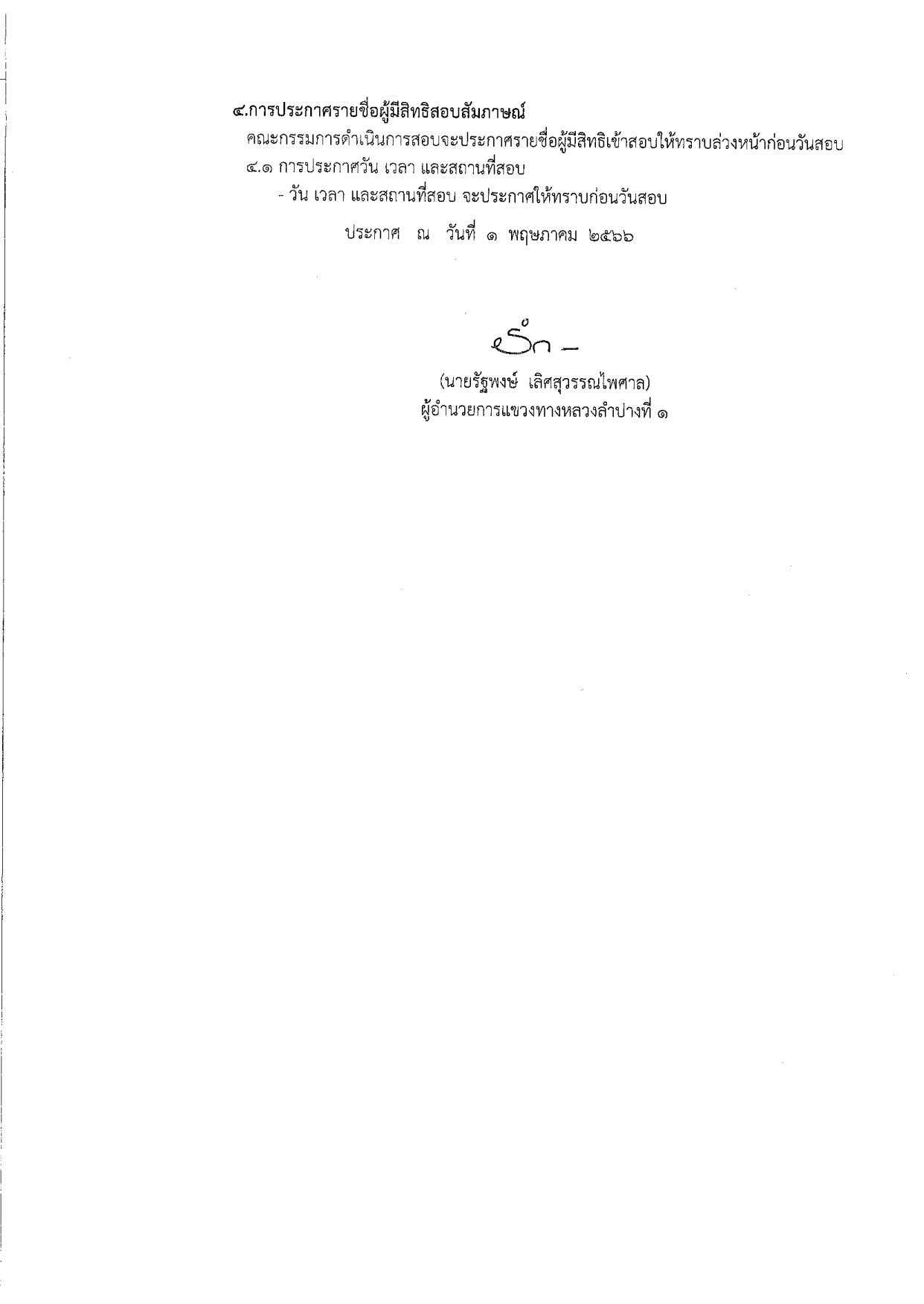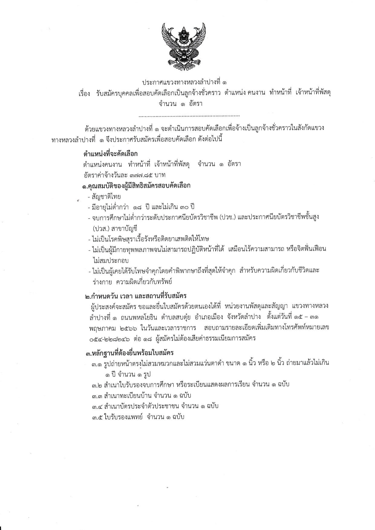116 15/05/2566 ประกาศแขวงทางหลวงลำปางที่ ๑ รับสมัครบุคคลเพื่อสอบคัดเลือกเป็นลูกจ้างชั่วคราว ตำแหน่ง คนงาน ทำหน้าที่ เจ้าหน้าที่พัสดุ จำนวน ๑ อัตรา