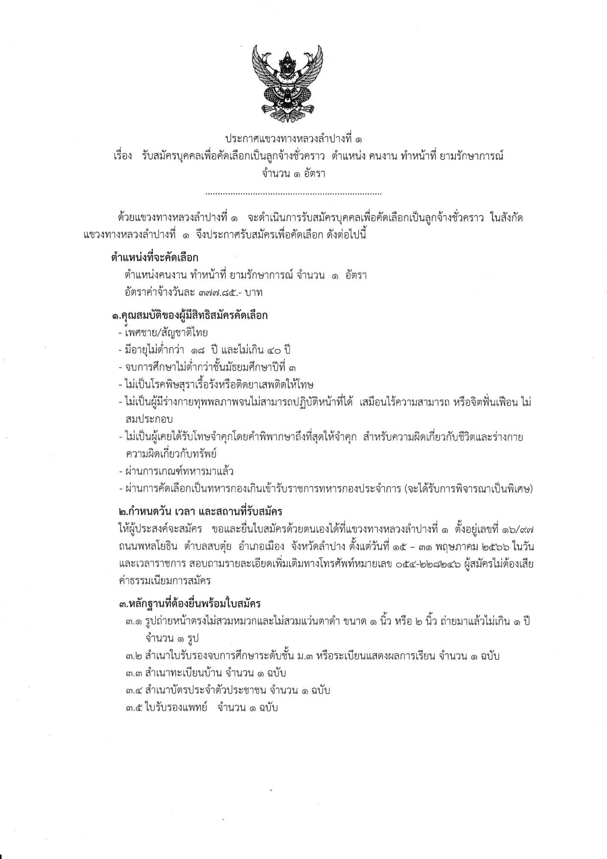 115 15/05/2566 ประกาศแขวงทางหลวงลำปางที่ ๑ รับสมัครบุคคลเพื่อสอบคัดเลือกเป็นลูกจ้างชั่วคราว ตำแหน่ง คนงาน ทำหน้าที่ ยามรักษาการณ์ จำนวน ๑ อัตรา