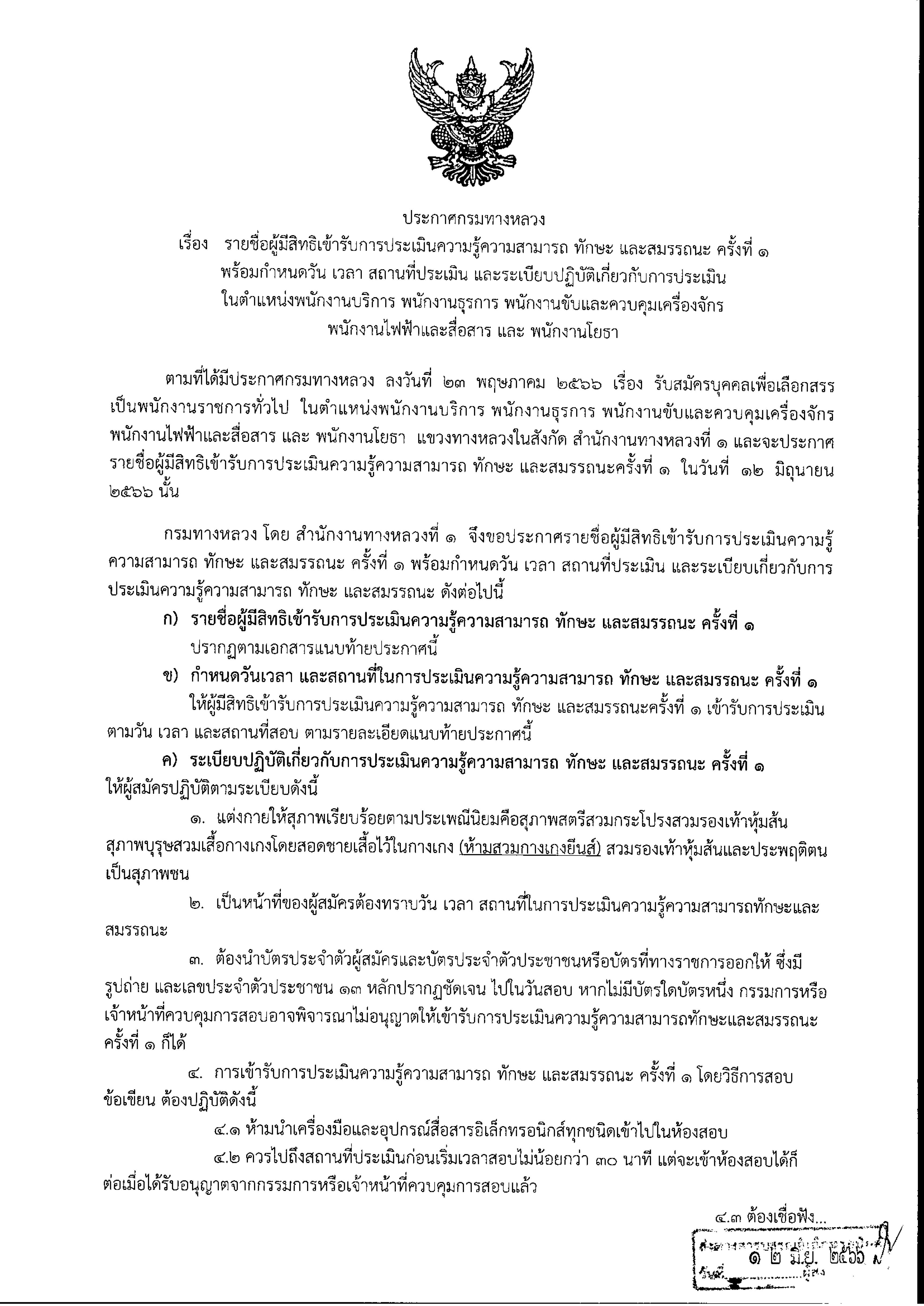 109 29/06/2566 ประกาศกรมทางหลวง เรื่อง รายชื่อผู้ผ่านการประเมินความรู้ความสามารถ ทักษะ และสมรรถนะ ครั้งที่ 1 และมีสิทธิเข้ารับการประเมินความรู้ ความสามารถ ทักษะ และสมรรถนะ ครั้งที่ 2 พร้อมกำหนดวัน เวลา และสถานที่สอบ ในตำแหน่ง พนักงานบริการ พนักงานธุรการ พนักงานขับและควบคุมเครื่องจักร พนักงานไฟฟ้าและสื่อสารและพนักงานโยธา