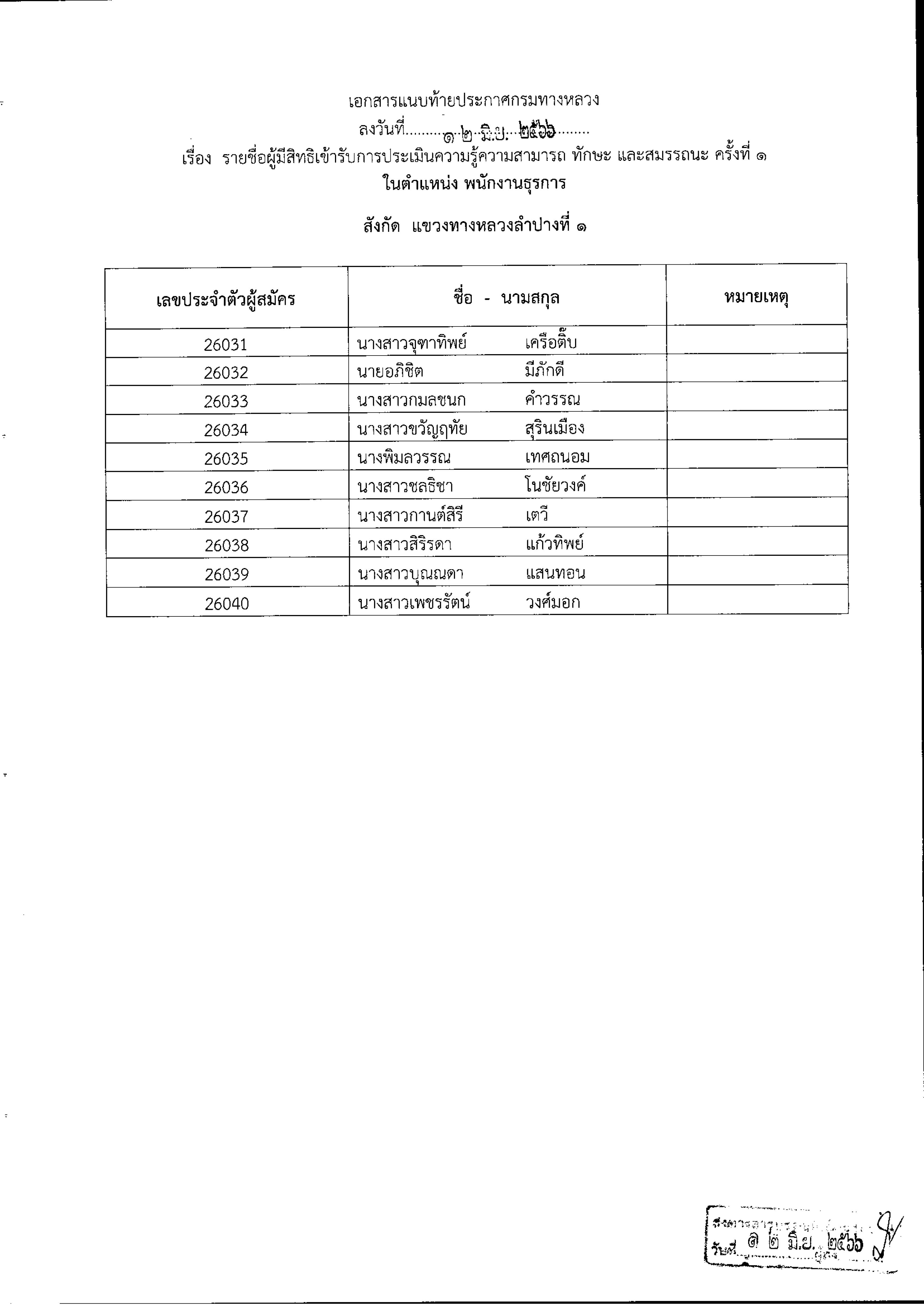 110 12/06/2566 ประกาศรายชื่อผู้มีสิทธิ์เข้ารับการประเมินความรู้ตวามสามารถ ทักษะ และสมรรถนะ ครั้งที่ 1 กำหนด วัน เวลา สถานที่ประเมิน และระเบียบปฏิบัติเกี่ยวกับการประเมินเพื่อเลือกสรรเป็นพนักงานราชการทั่วไป