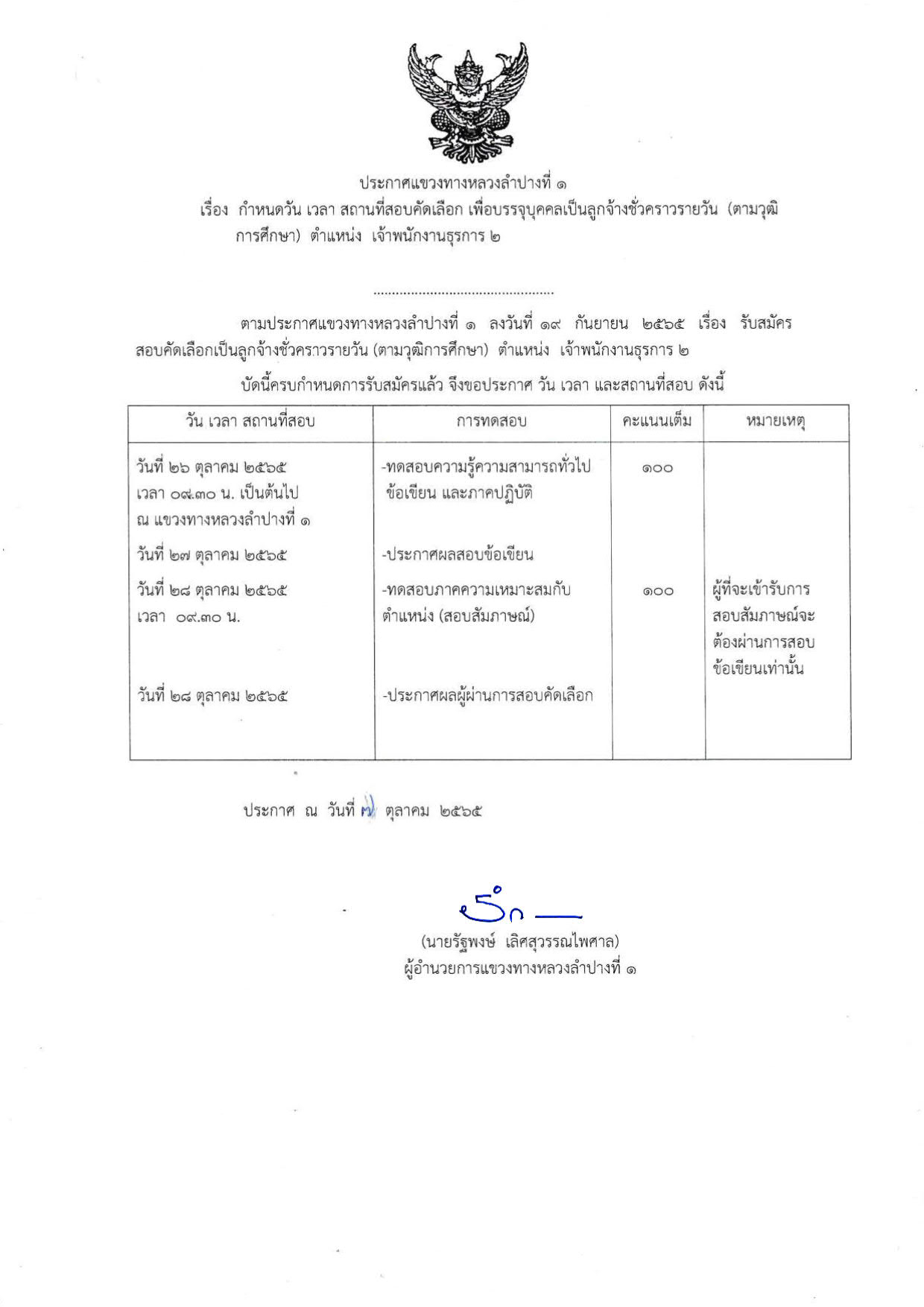เพื่อบรรจุบุคคลเป็นลูกจ้างชั่วคราวรายวันดังกล่าว ในวันที่ ๒๖ ตุลาคม ๒๕๖๕ เวลา ๐๙.๓๐ น. เป็นต้นไป ณ แขวงทางหลวงลำปางที่ ๑