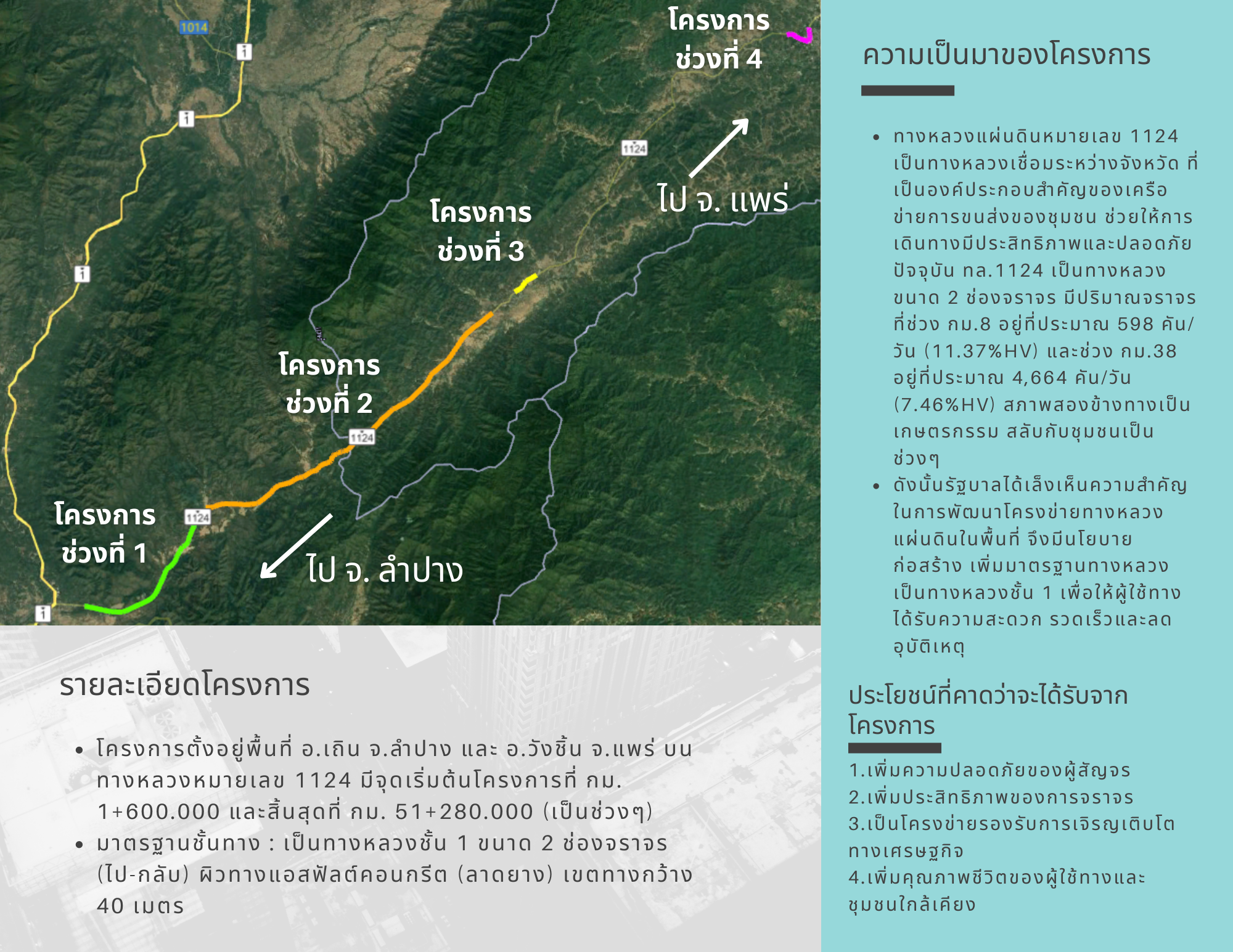 โครงการตั้งอยู่บนพื้นที่ อ.เถิน จ.ลำปาง และ อ.วังชิ้น จ.แพร่ บนทางหลวงหมายเลข 1124 มีจุดเริ่มต้นโครงการที่ กม.1+600.000 และสิ้นสุดที่ กม.51+280.000 (เป็นช่วงๆ)