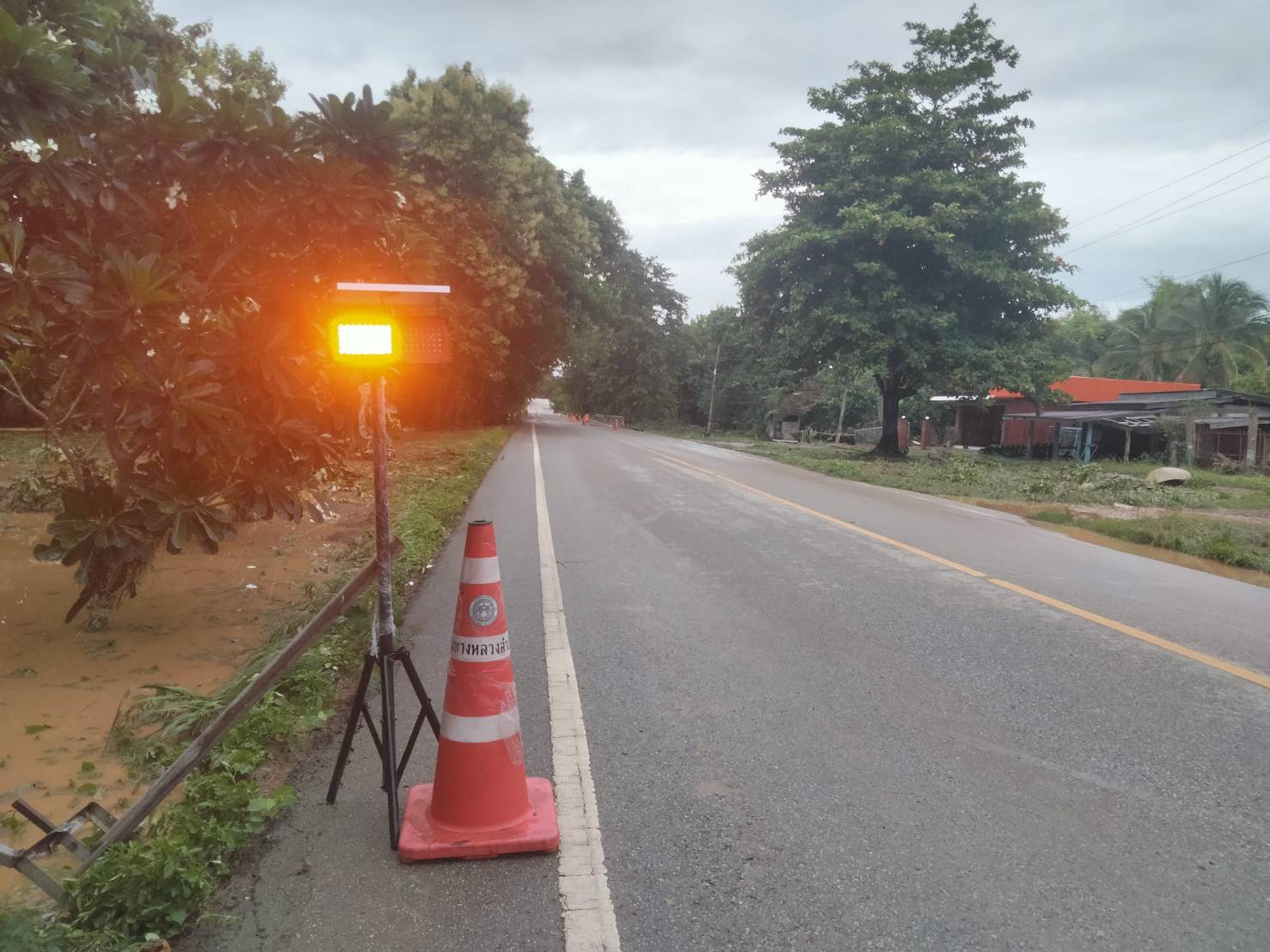 ได้ดำเนินการติดตั้งป้ายเตือน ถังยาง กรวยยาง และสัญญานไฟกระพริบ บริเวณคอสะพานจุดที่ผิวจราจรได้รับความเสียหาย จากกรณีน้ำท่วมทาง