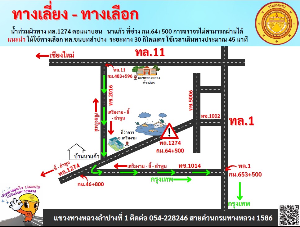 ทั้งนี้ ขอให้ประชาชนเดินทางด้วยความระมัดระวัง ปฏิบัติตามป้ายเตือนน้ำท่วม ป้ายแนะนำ และคำแนะนำของเจ้าหน้าที่อย่างเคร่งครัด เพื่อความปลอดภัยในการเดินทาง พร้อมช่วยเหลือผู้ประสบภัยและเฝ้าระวังสถานการณ์ตลอดเวลา หากประชาชนต้องการสอบถามสภาพเส้นทาง สภาพการจราจร หรือต้องการความช่วยเหลือสามารถติดต่อได้ที่สำนักงานทางหลวง แขวงทางหลวง หมวดทางหลวงในพื้นที่ และสายด่วนกรมทางหลวง 1586 (โทรฟรีทุกเครือข่ายตลอด 24 ชั่วโมง)