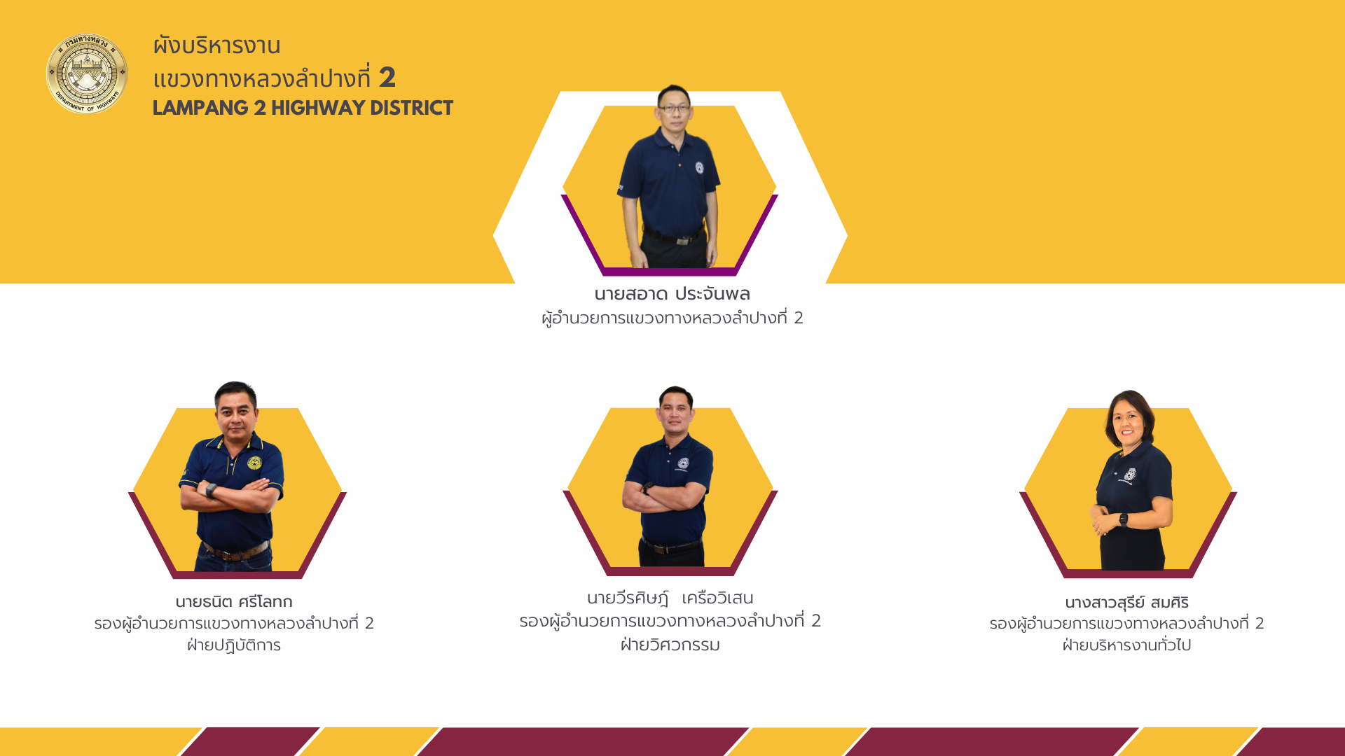 วิสัยทัศน์ : มุ่งสู่ความเป็นองค์กรชั้นนำด้านงานทาง เชื่อมโยงการขนส่งอย่างยั่งยืน