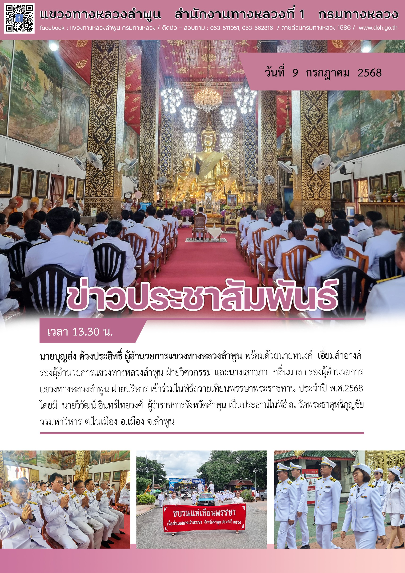 เข้าร่วมในพิธีถวายเทียนพรรษาพระราชทาน ประจำปี พ.ศ.2568 โดยมี นายวิวัฒน์ อินทร์ไทยวงศ์ ผู้ว่าราชการจังหวัดลำพูน เป็นประธานในพิธี ณ วัดพระธาตุหริภุญชัยวรมหาวิหาร ตำบลในเมือง อำเภอเมืองลำพูน จังหวัดลำพูน