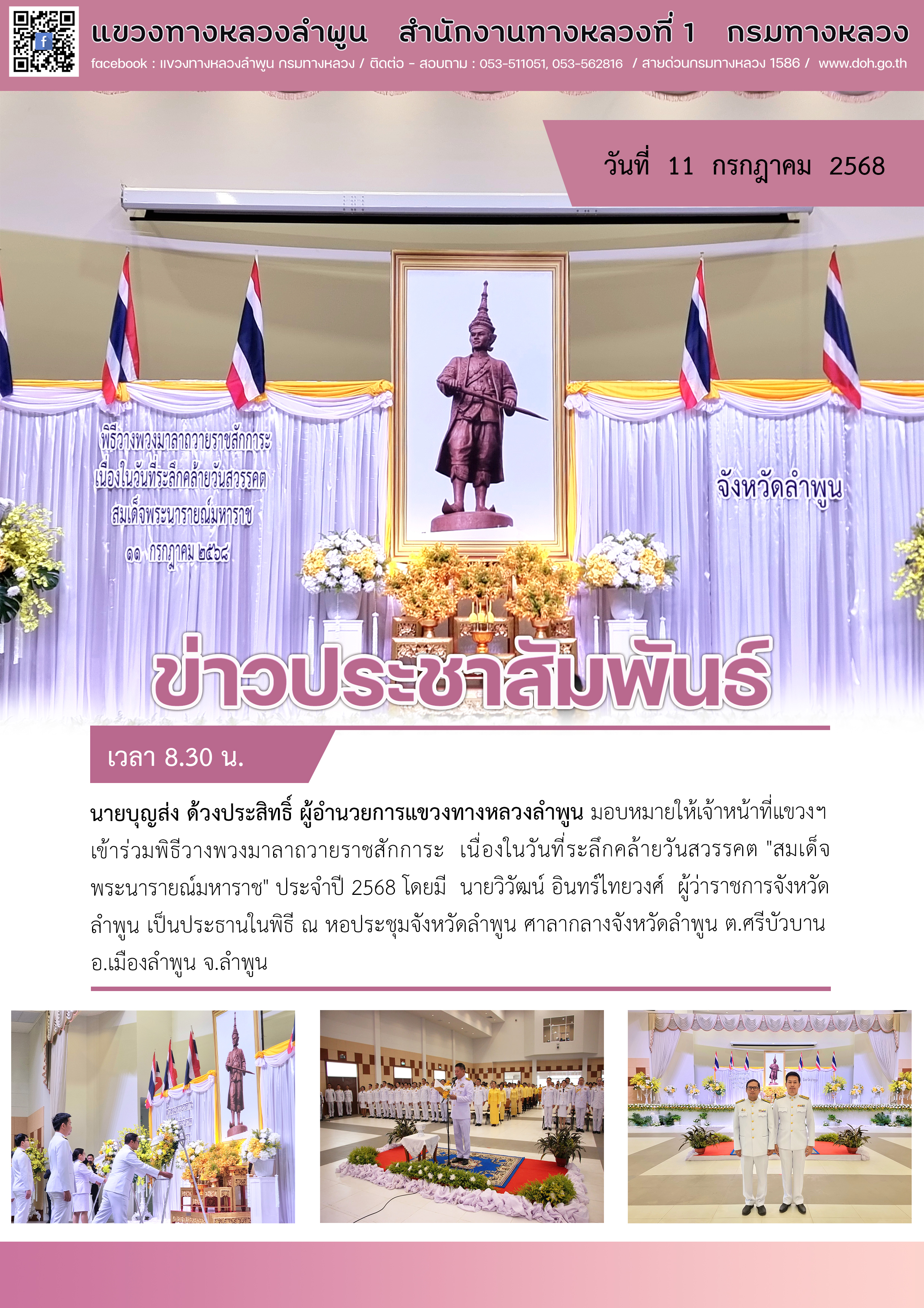 นายบุญส่ง ด้วงประสิทธิ์ ผู้อำนวยการแขวงทางหลวงลำพูน มอบหมายให้เจ้าหน้าที่แขวงฯ เข้าร่วมพิธีวางพวงมาลาถวายราชสักการะ เนื่องในวันที่ระลึกคล้ายวันสวรรคต "สมเด็จพระนารายณ์มหาราช" ประจำปี ๒๕๖๘ โดยมี นายวิวัฒน์ อินทร์ไทยวงศ์ ผู้ว่าราชการจังหวัดลำพูน เป็นประธานในพิธี ณ หอประชุมจังหวัดลำพูน ศาลากลางจังหวัดลำพูน ตำบลศรีบัวบาน อำเภอเมืองลำพูน จังหวัดลำพูน เมื่อวันที่ ๑๑ กรกฎาคม ๒๕๖๘