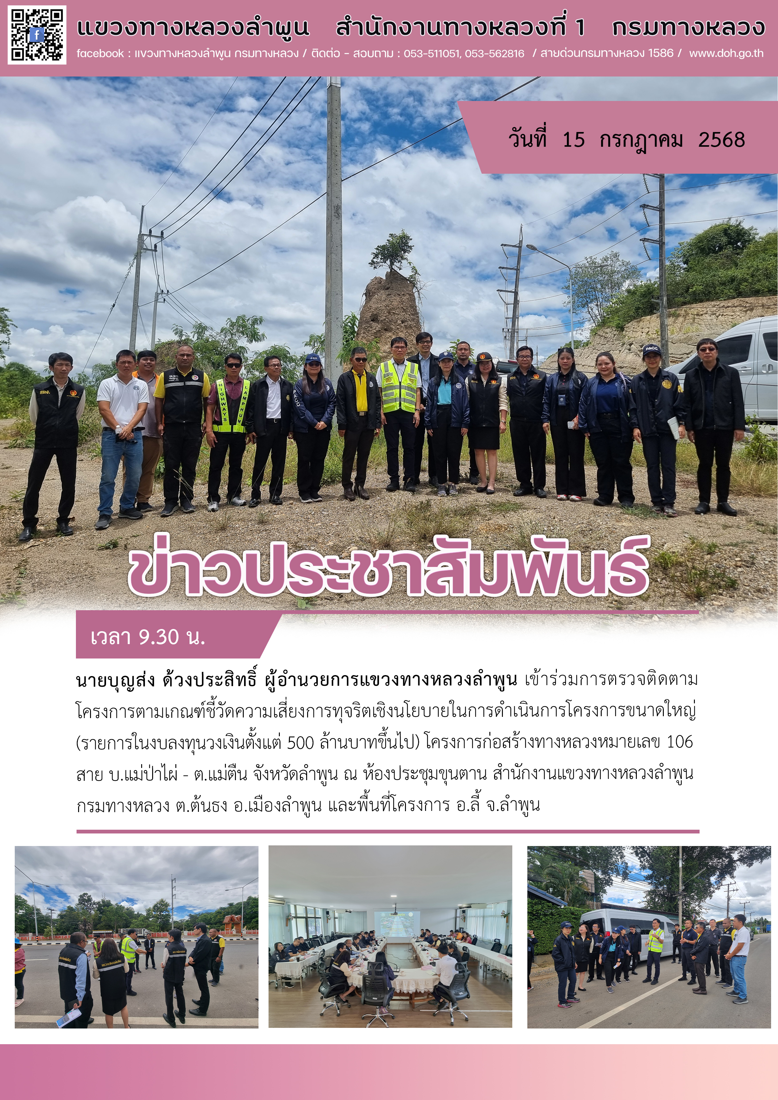 นายบุญส่ง ด้วงประสิทธิ์ ผู้อำนวยการแขวงทางหลวงลำพูน เข้าร่วมการตรวจติดตามโครงการตามเกณฑ์ชี้วัดความเสี่ยงการทุจริตเชิงนโยบายในการดำเนินการโครงการขนาดใหญ่ (รายการในงบลงทุนวงเงินตั้งแต่ 500 ล้านบาทขึ้นไป) ณ ห้องประชุมขุนตาน สำนักงานแขวงทางหลวงลำพูน กรมทางหลวง อำเภอเมืองลำพูน จังหวัดลำพูน และลงพื้นที่โครงการก่อสร้างทางหลวงหมายเลข 106 สาย บ้านแม่ป่าไผ่ - ตำบลแม่ตืน อำเภอลี้ จังหวัดลำพูน
