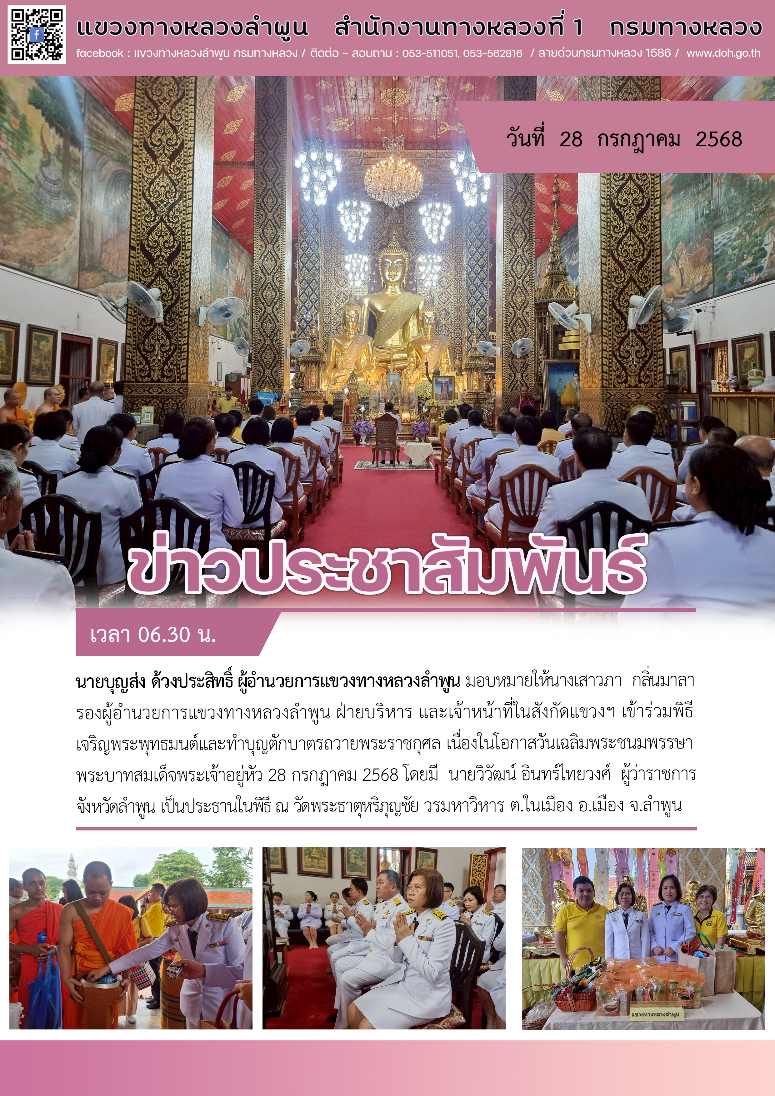 นายบุญส่ง ด้วงประสิทธิ์ ผู้อำนวยการแขวงทางหลวงลำพูน มอบหมายให้นางเสาวภา กลิ่นมาลา รองผู้อำนวยการแขวงทางหลวงลำพูน ฝ่ายบริหาร และเจ้าหน้าที่ในสังกัดแขวงฯ เข้าร่วมพิธีเจริญพระพุทธมนต์และพิธีทำบุญตักบาตรถวายพระราชกุศล เนื่องในโอกาสวันเฉลิมพระชนมพรรษา พระบาทสมเด็จพระเจ้าอยู่หัว โดยมี นายวิวัฒน์ อินทร์ไทยวงศ์ ผู้ว่าราชการจังหวัดลำพูน เป็นประธานในพิธี ณ วัดพระธาตุหริภุญชัยวรมหาวิหาร ตำบลในเมือง อำเภอเมืองลำพูน จังหวัดลำพูน เมื่อวันที่ ๒๘ กรกฎาคม ๒๕๖๘ เวลา ๐๖.๓๐ น.